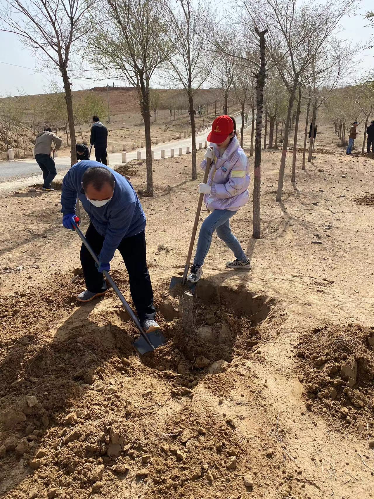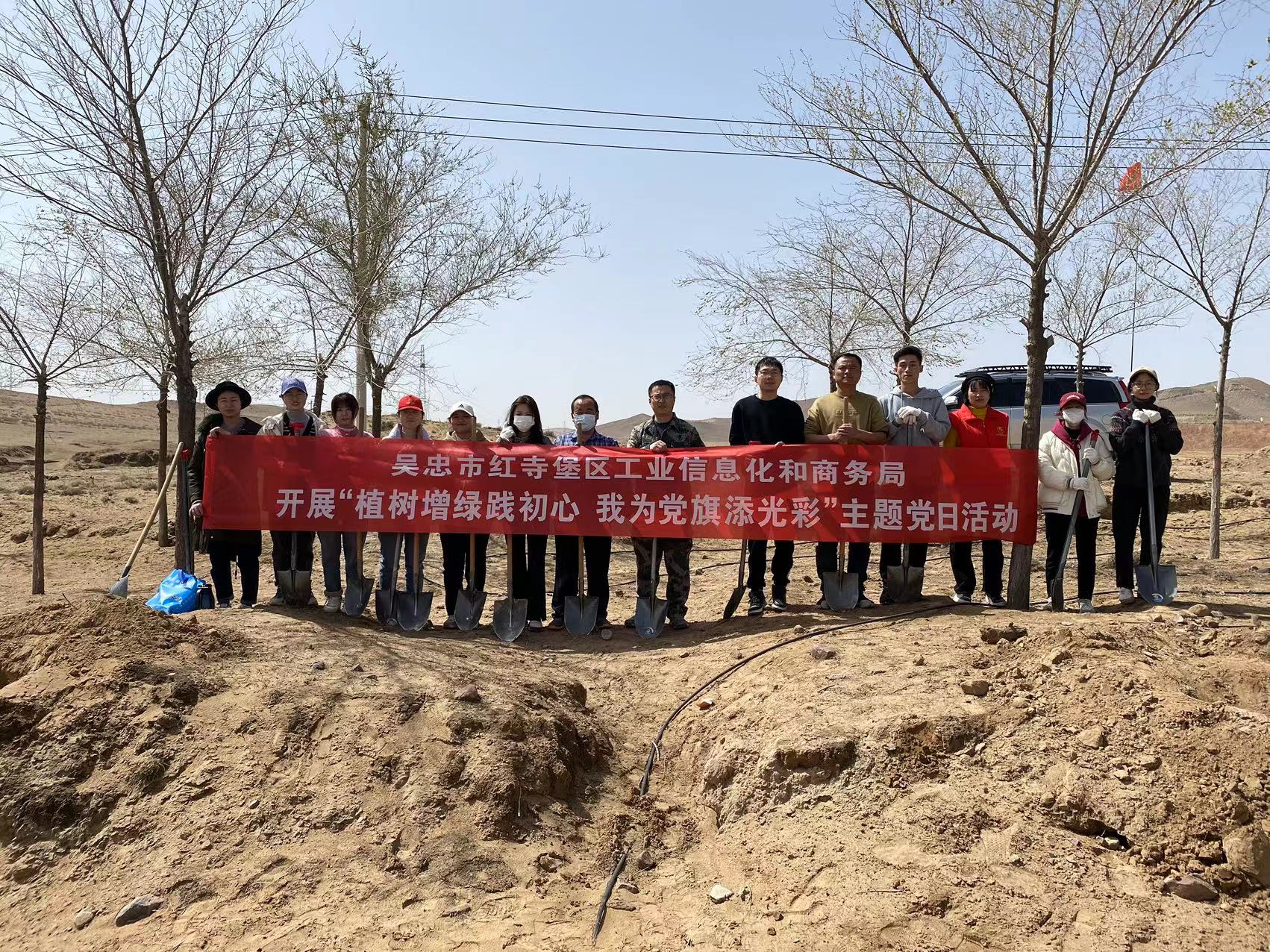植树现场,党旗飘扬,干部们个个精神抖擞,2人一组,3人一队,分工协作、默契配合、干劲十足,现场一派繁忙有序的景象。红寺堡区工业信息化和商务局以实际行动践行和弘扬“绿水青山就是金山银山”的生态理念,为建设美丽家园、绿色家园做出了贡献。