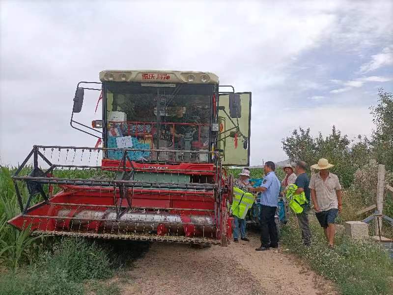 二、加大隐患排查力度,筑牢农机安全防线。组织人员对农机经销企业、农机作业服务组织和农机专业合作社进行安全生产隐患摸排,并深入农机作业现场,检查联合收割机的安全技术状态、驾驶操作证件、跨区作业证持证状况,并给作业的收割机粘贴反光条、给驾驶操作人员发放反光背心、遮阳帽等,目前共发放农机反光条480余条、反光背心80件、遮阳帽80顶、手套60双。