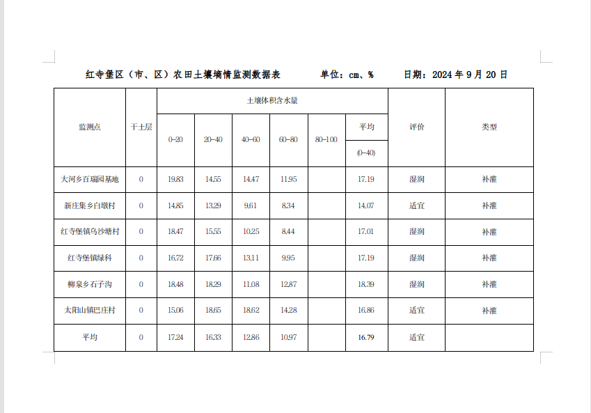 经2024年9月18日、9月19日对全区5个乡镇9个固定农田土壤墒情监测点及6个随机点节水灌溉耕地0-80cm土壤体积含水量进行土壤墒情速测仪监测,数据分析表明: