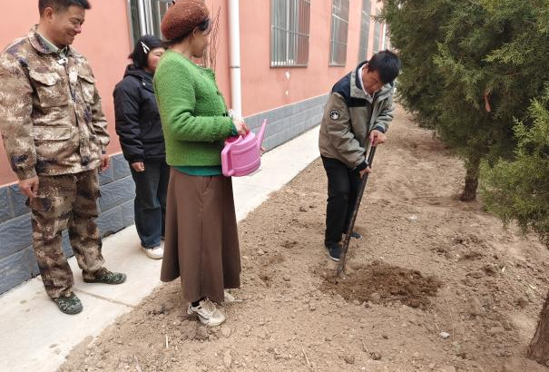 一位肢体残疾人员,虽然握笔有些吃力,但在志愿者的帮扶下,依然专注地完成了自己的作品,她的画中,一棵开满绿色花朵的树傲然挺立,象征着顽强的生命力。绘画环节结束后,大家又一同来到残疾人之家的小花园,在工作人员的指导下,小心翼翼地将一株株充满生机的树苗植入土中,培土、浇水,每一个步骤都做得格外认真。他们用自己的双手,亲手种下了希望的树苗,也种下了对未来生活的美好期盼。