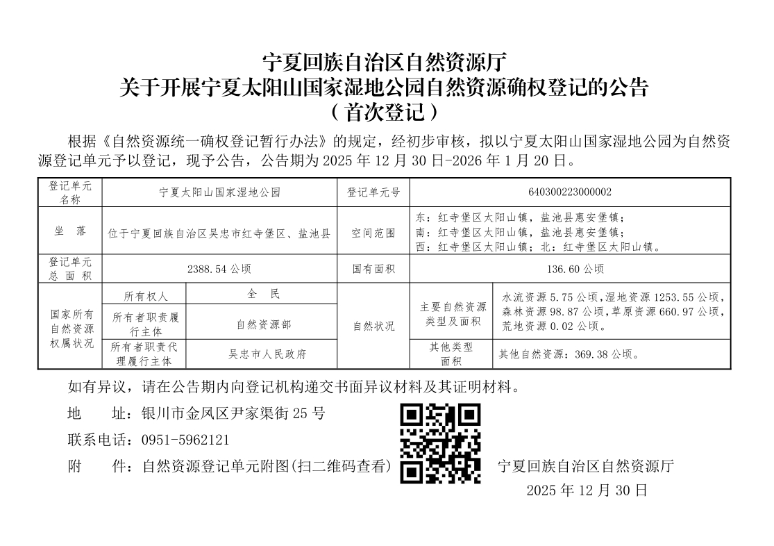 关于开展宁夏太阳山国家湿地公园自然资源确权登记的公告(首次登记)