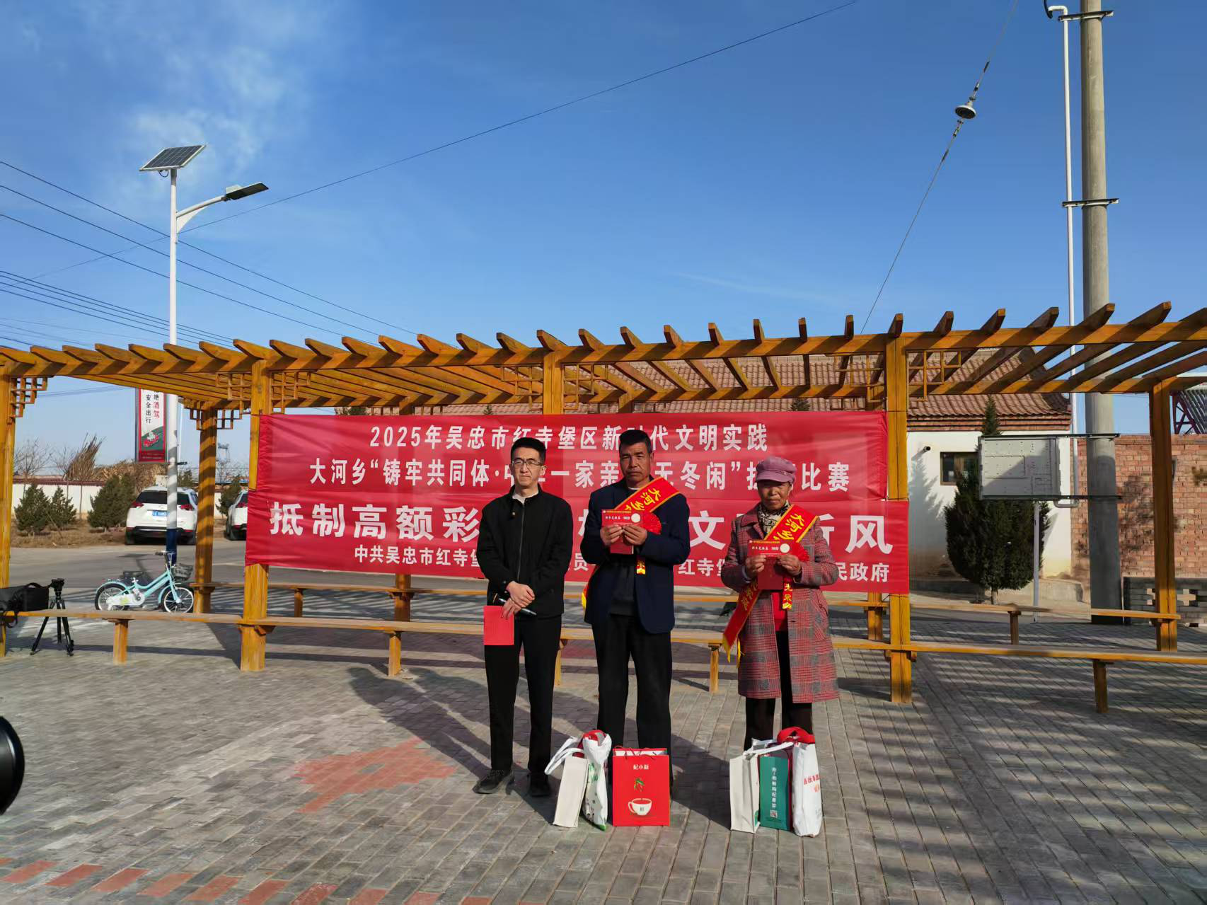 活动现场,大河副乡长闫圆用家乡话为党员群众解读了抵制高额彩礼的相关政策,宣讲了红寺堡区25项礼遇嘉许措施。为徐向龙与吕瑞瑞、李永兴与杨苗弟两个“低彩礼”家庭代表颁发光荣证,并送上300分“新时代文明实践积分”及床上用品“四件套”等奖励,用身边的榜样带动党员群众践行婚事简办、厚养薄葬的新风俗。