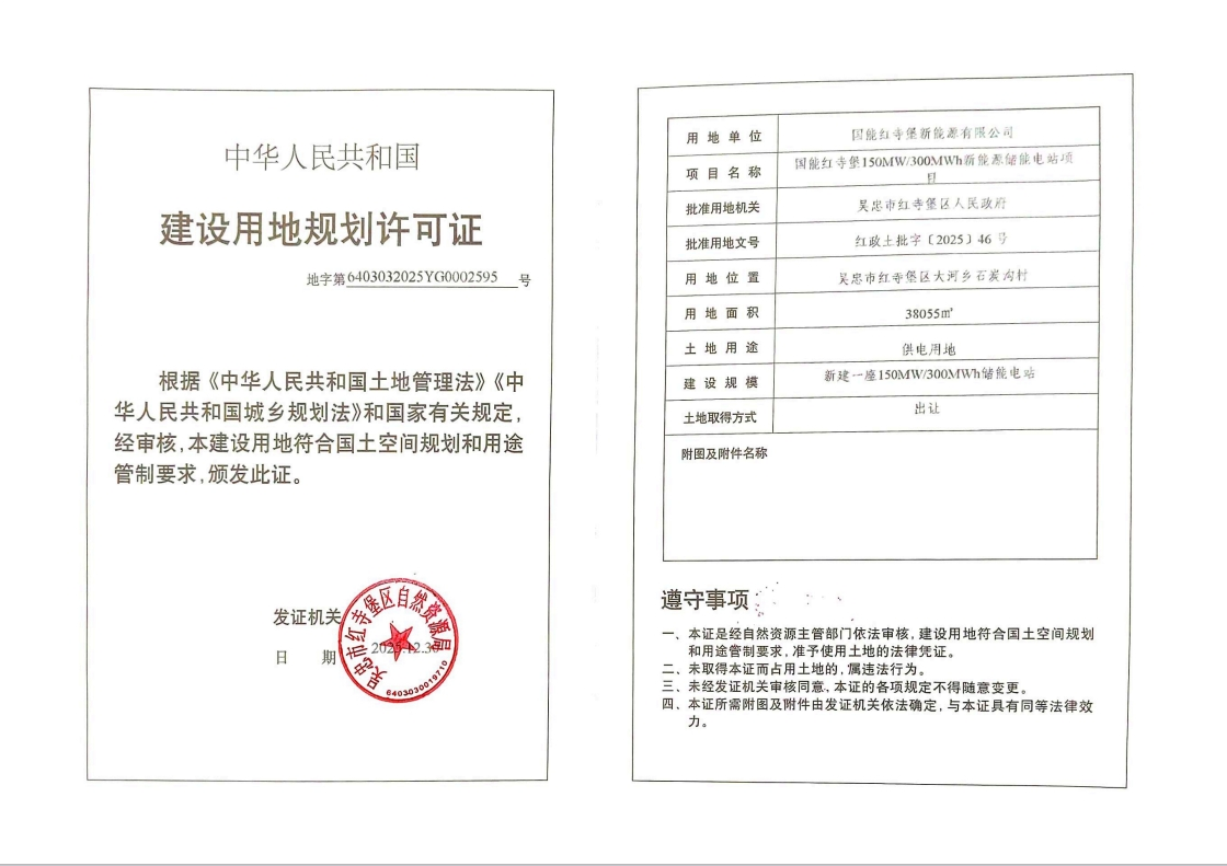 国能红寺堡150MW/300MWh新能源共享储能电站项目(建设用地规划许可证)