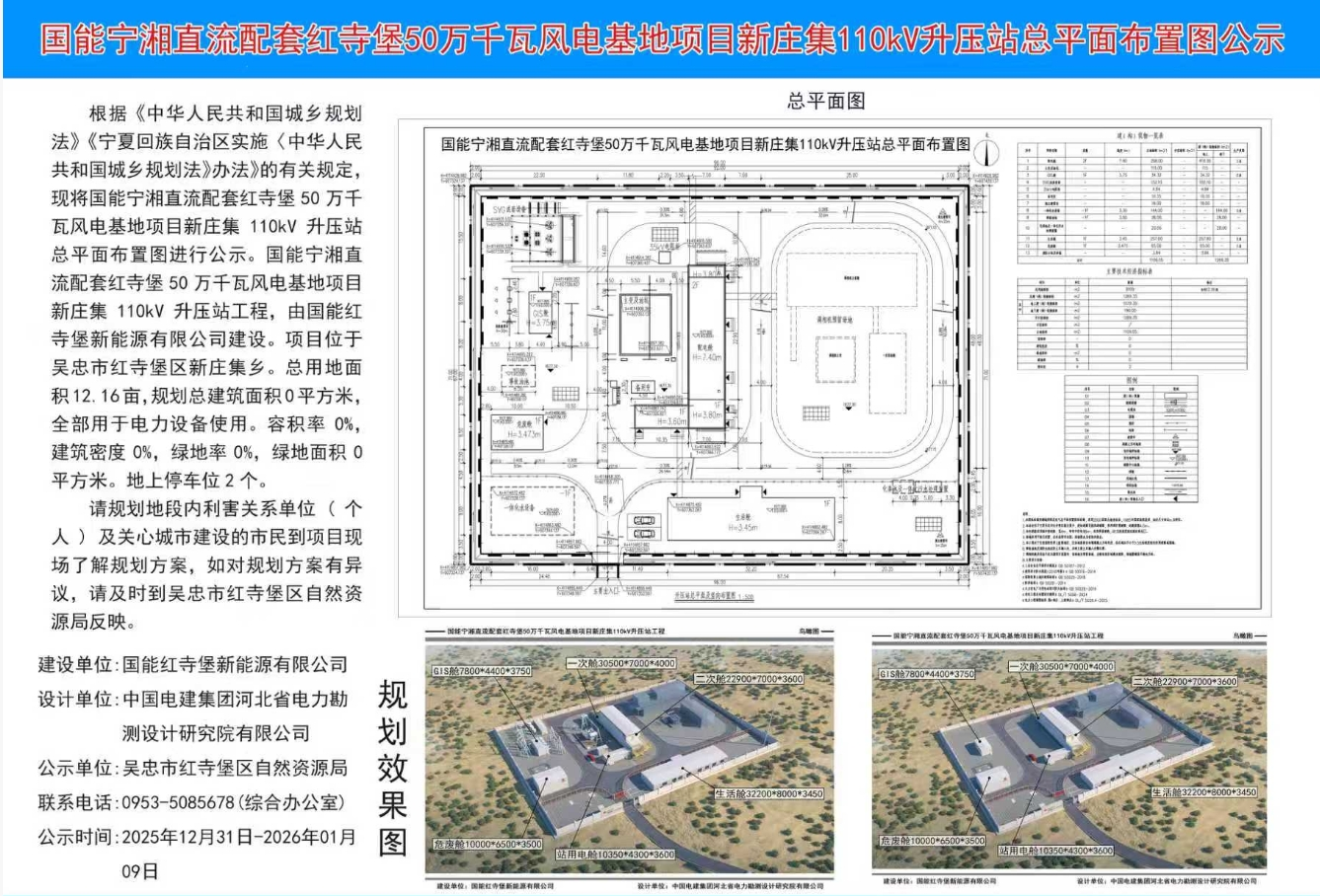 国能宁湘直流配套50万千瓦风电基地项目红寺堡110kV升压站总平面布置图公示