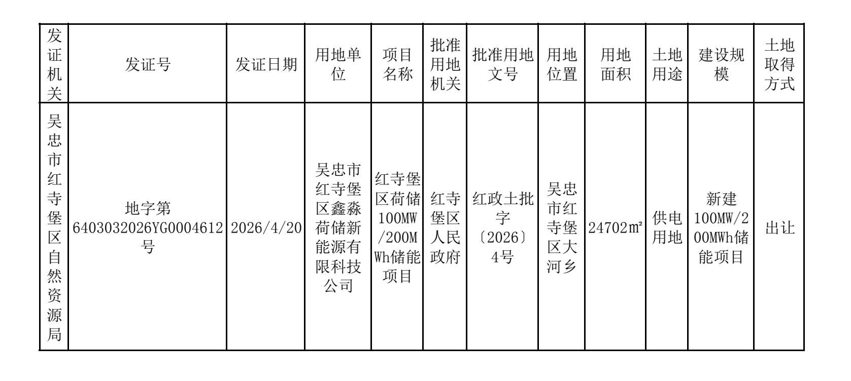 红寺堡区荷储100MW200MWh储能项目建设用地规划许可证