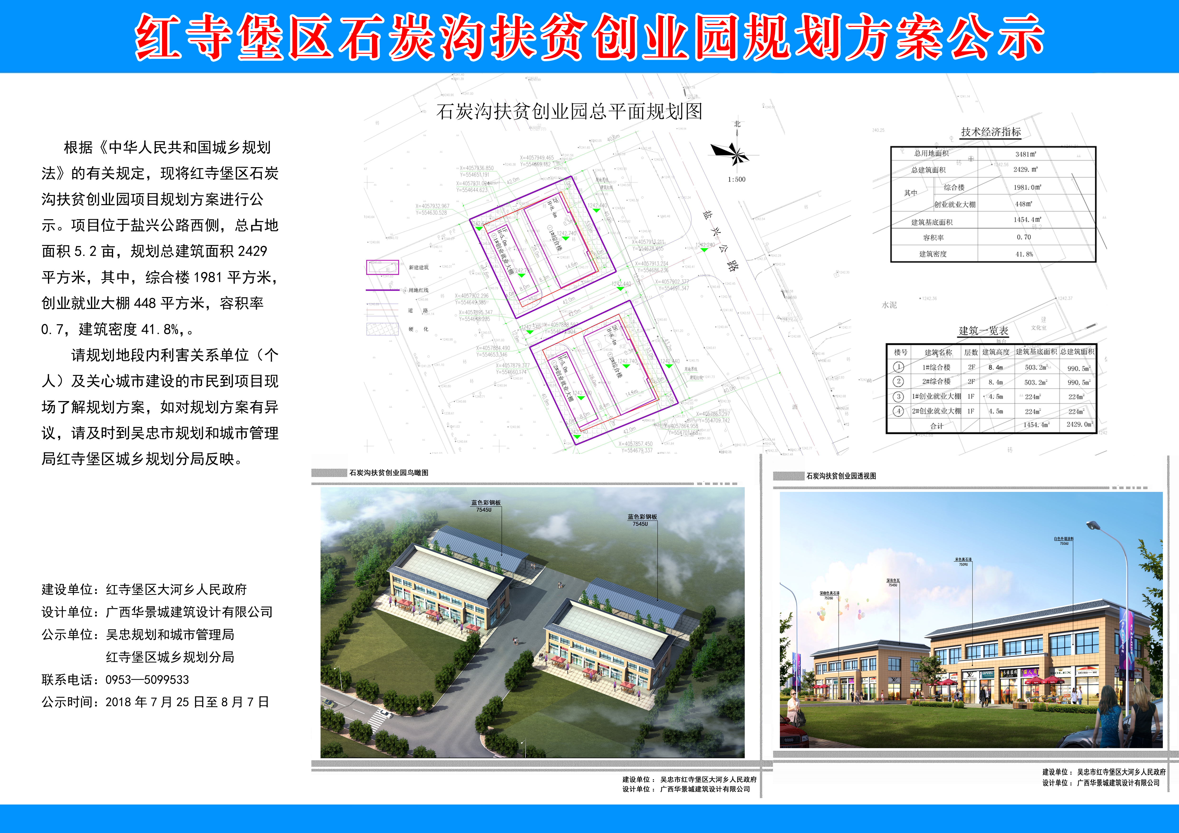 根据《中华人民共和国城乡规划法》的有关规定,现将红寺堡区石炭沟扶贫创业园项目规划方案进行公示。项目位于盐兴公路西侧,总占地面积5.2亩,规划总建筑面积2429平方米,其中,综合楼1981平方米,创业就业大棚448平方米,容积率0.7,建筑密度41.8%,。