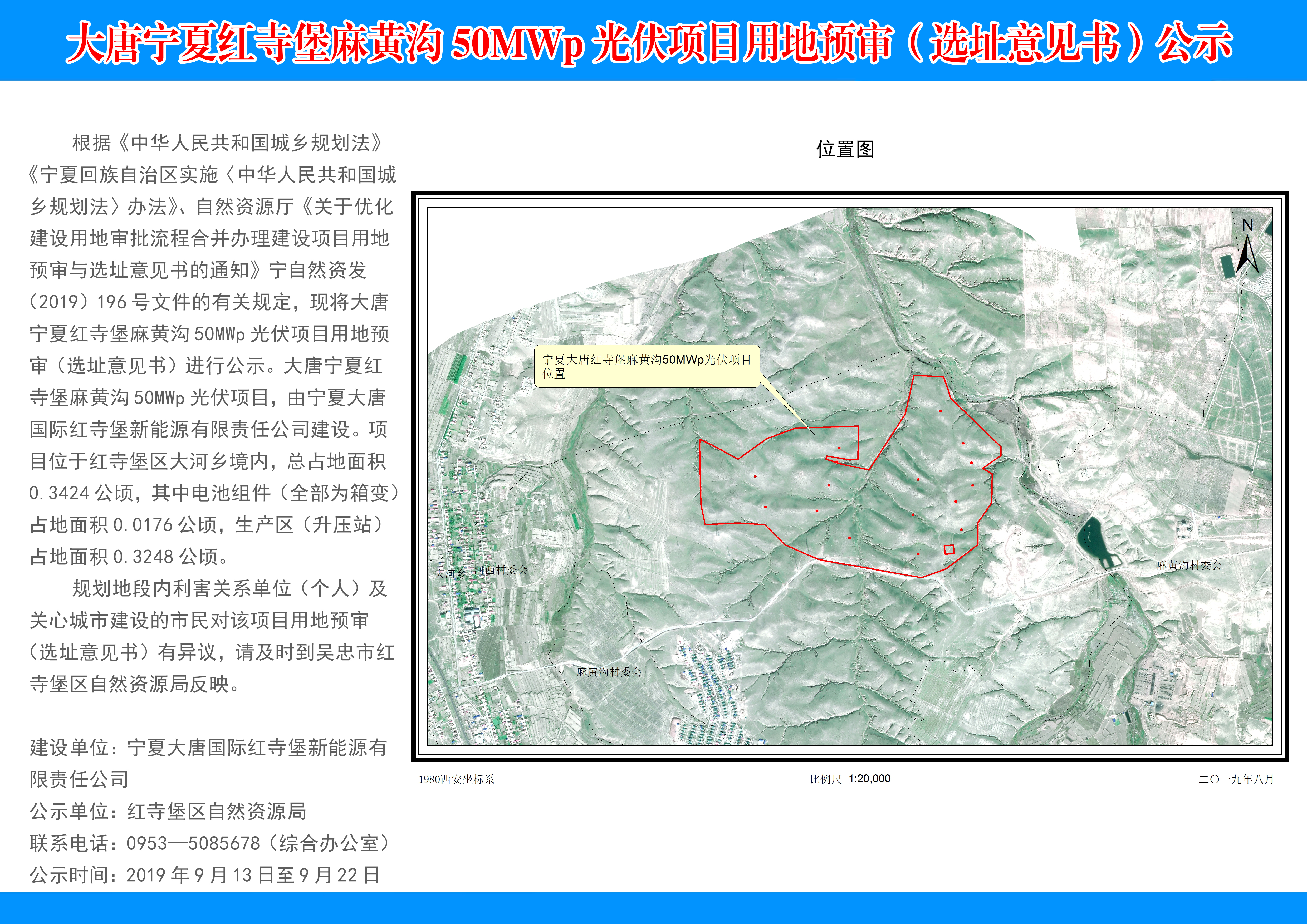 大唐宁夏红寺堡麻黄沟50MWp光伏项目用地预审(选址意见书)公示