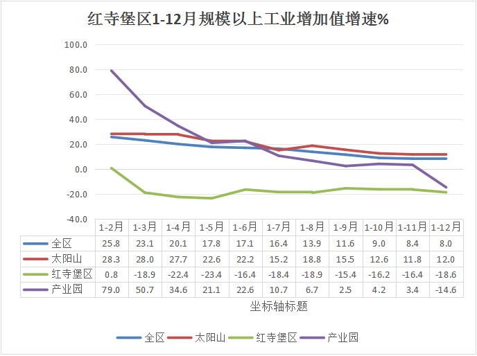 (二)太阳山开发区贡献突出,区本级发展承压前行。1-12月,太阳山开发区规模以上工业总产值同比增长3.3%,增加值同比增长12.0%,贡献率为129.8%,拉动全区规模以上工业增加值增长10.4个百分点;红寺堡区(含产业园)规模以上工业总产值同比下降13.76%,增加值同比下降18.6%,贡献率为-29.8%,下拉全区规模以上工业增加值2.4个百分点,其中,产业园规模以上工业总产值同比下降16.3%,增加值同比下降14.6%,贡献率为-6.2%,拉动全区规模以上工业增加值下降0.5个百分点。