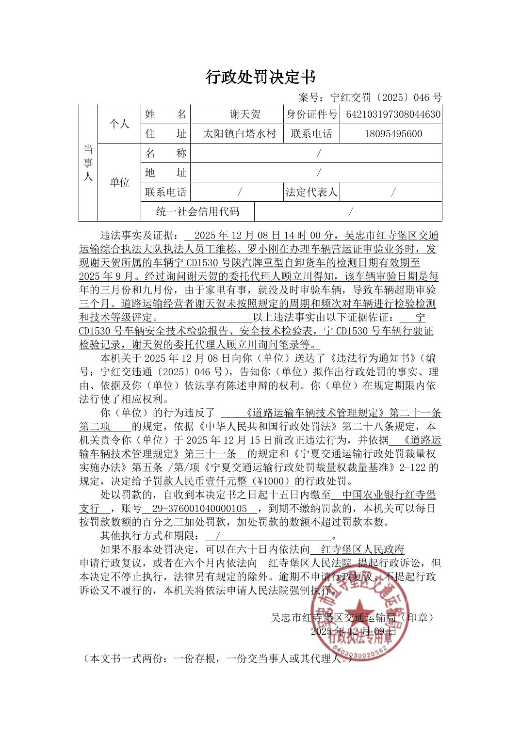 吴忠市红寺堡区交通运输局行政处罚决定书