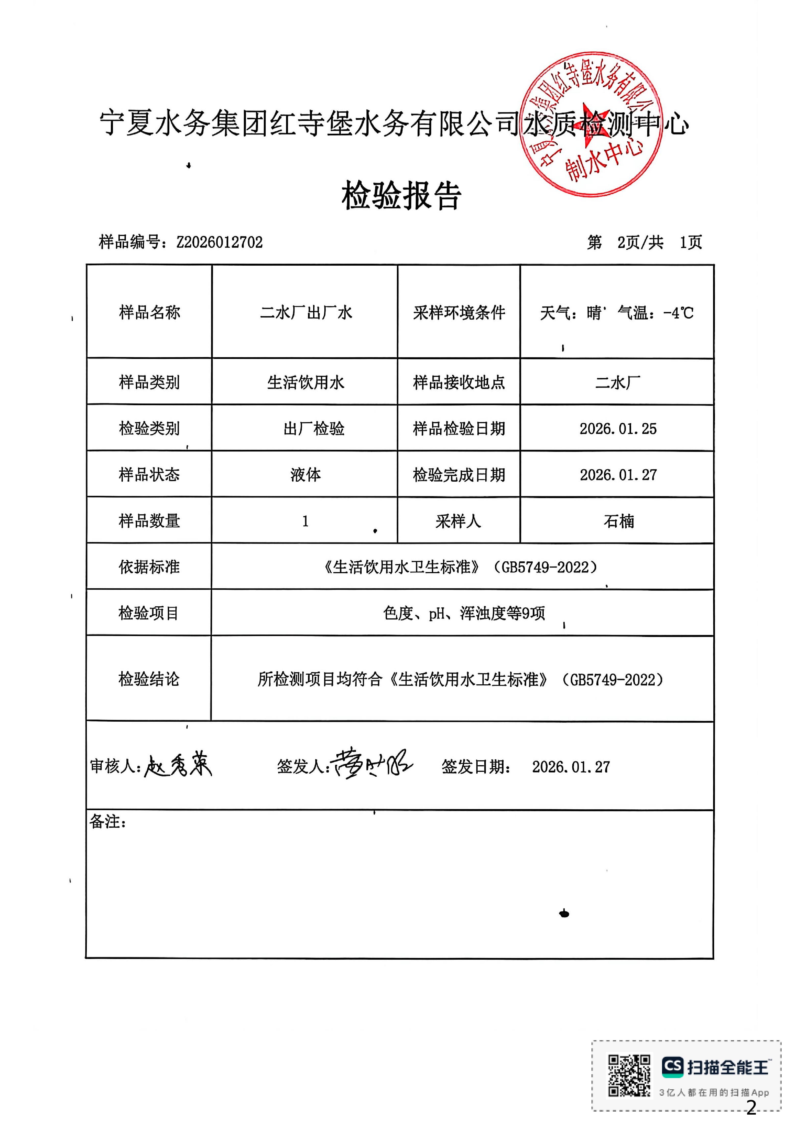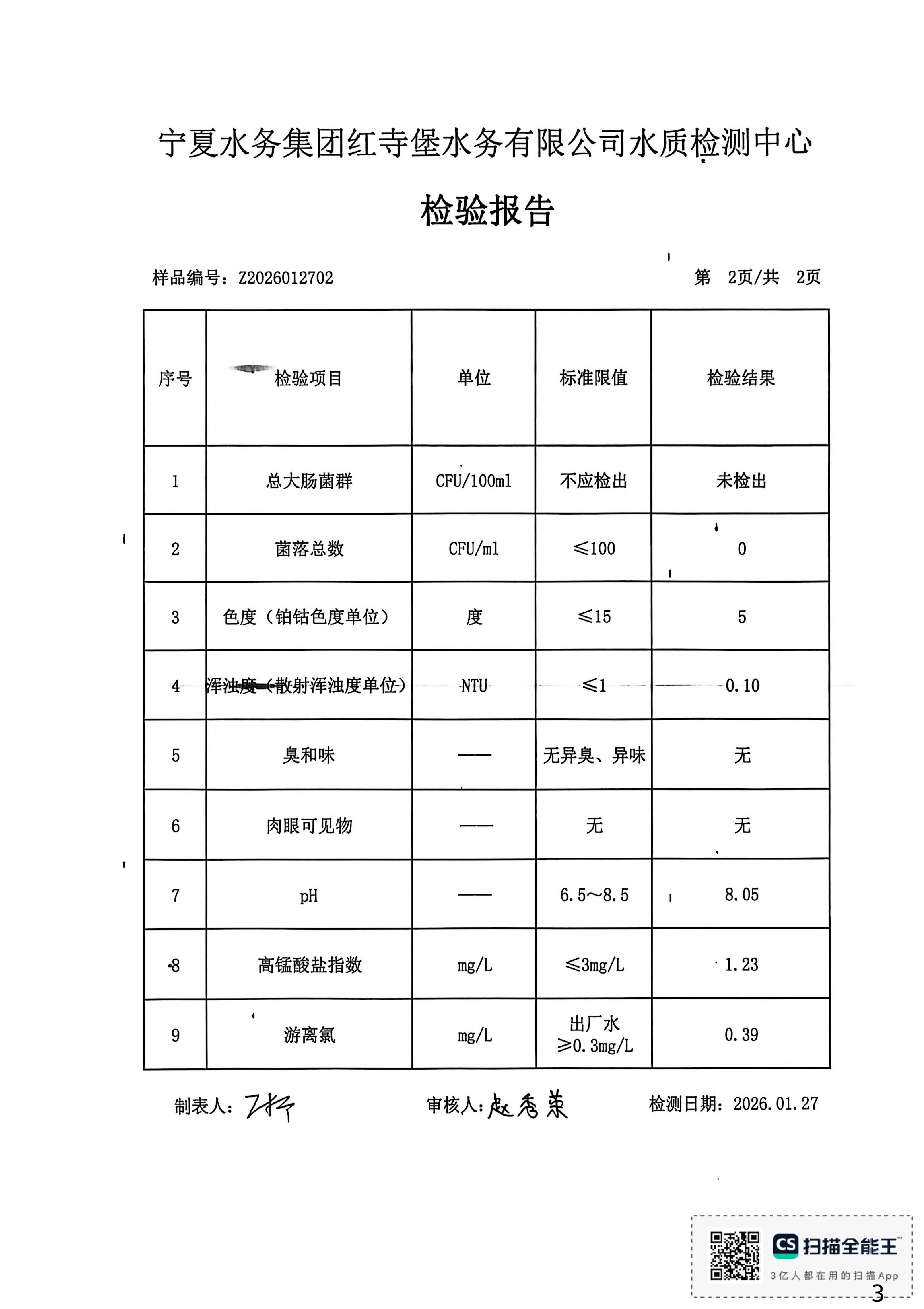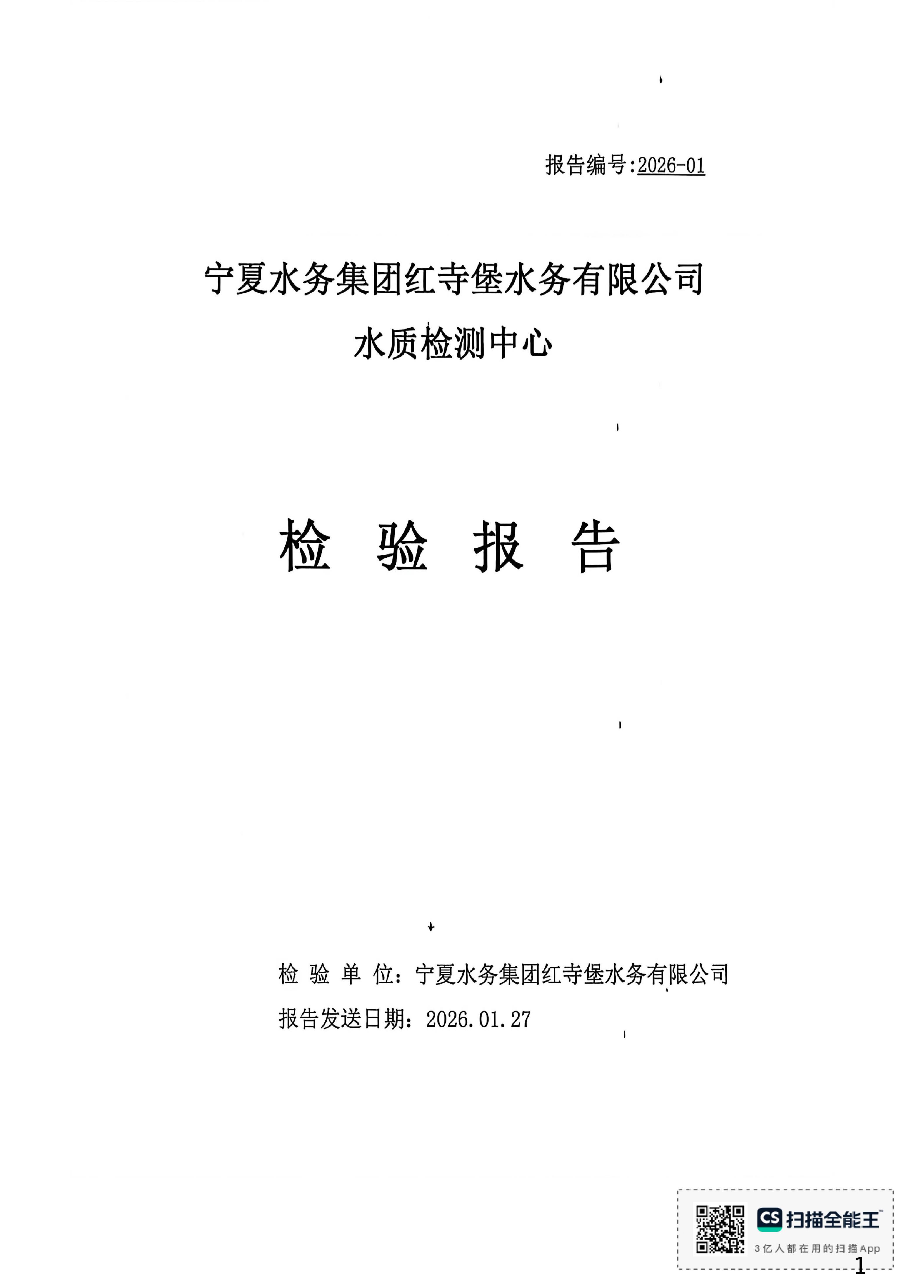 红寺堡区2026年1月份水质检测报告