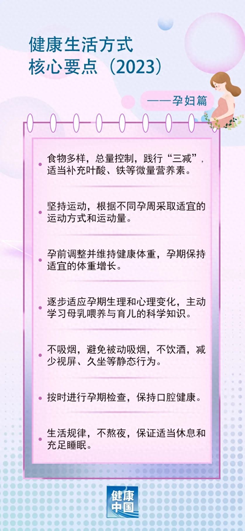 健康生活方式是指个体或群体为实现全生命周期的最佳健康目标而采取的行为模式。近日,全民健康生活方式行动国家行动办公室围绕孕妇、乳母、婴幼儿、儿童青少年、老年人及职业人群存在的健康问题,制定了《健康生活方式核心要点(2023)》,从合理饮食、规律运动、戒烟限酒、心理平衡、良好睡眠、积极社交、主动学习等方面对不同人群的健康生活方式给出了精准指导,引导各类人群积极践行文明健康的生活方式,推动“做自己健康第一责任人”理念的落实。