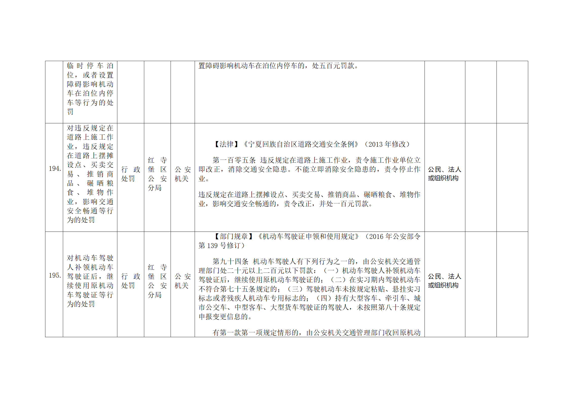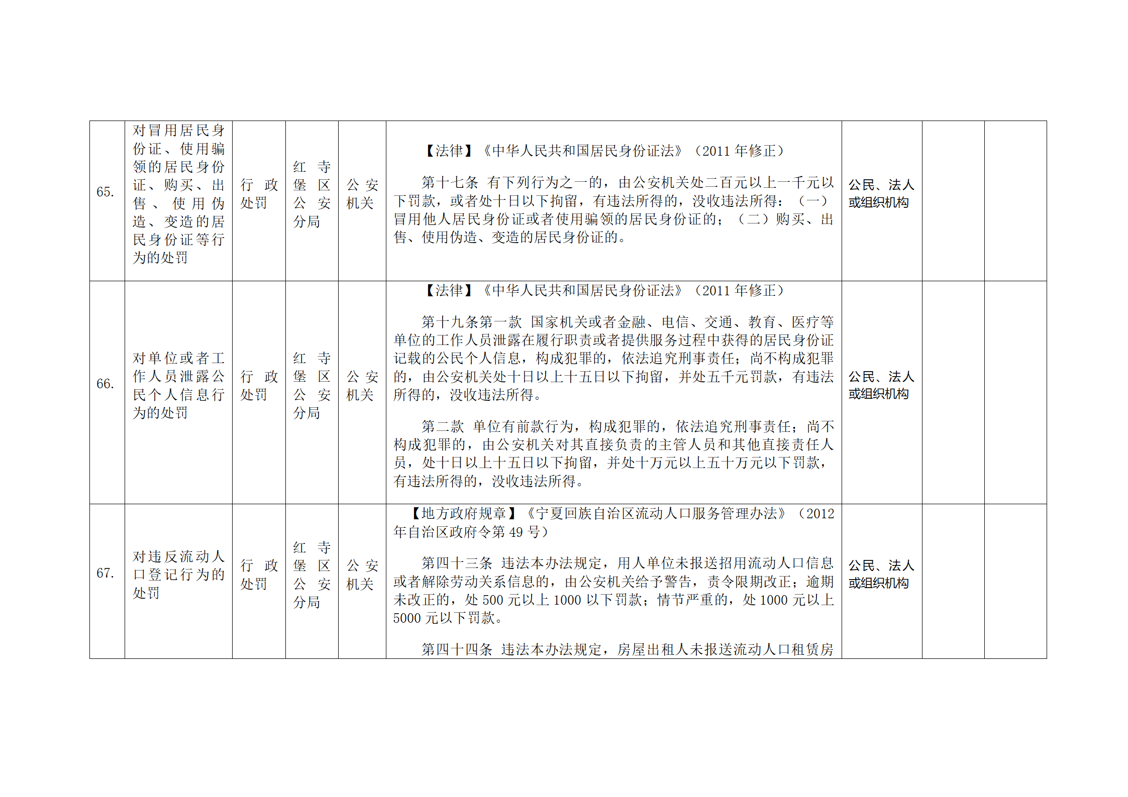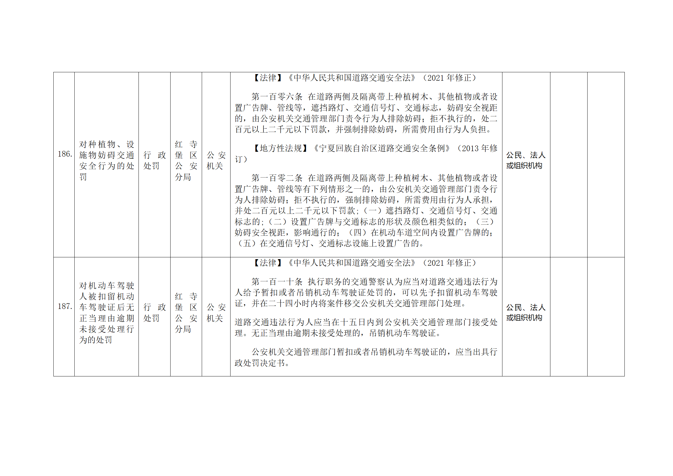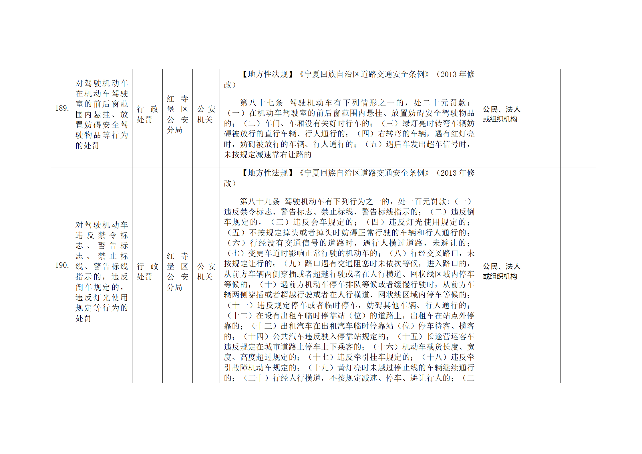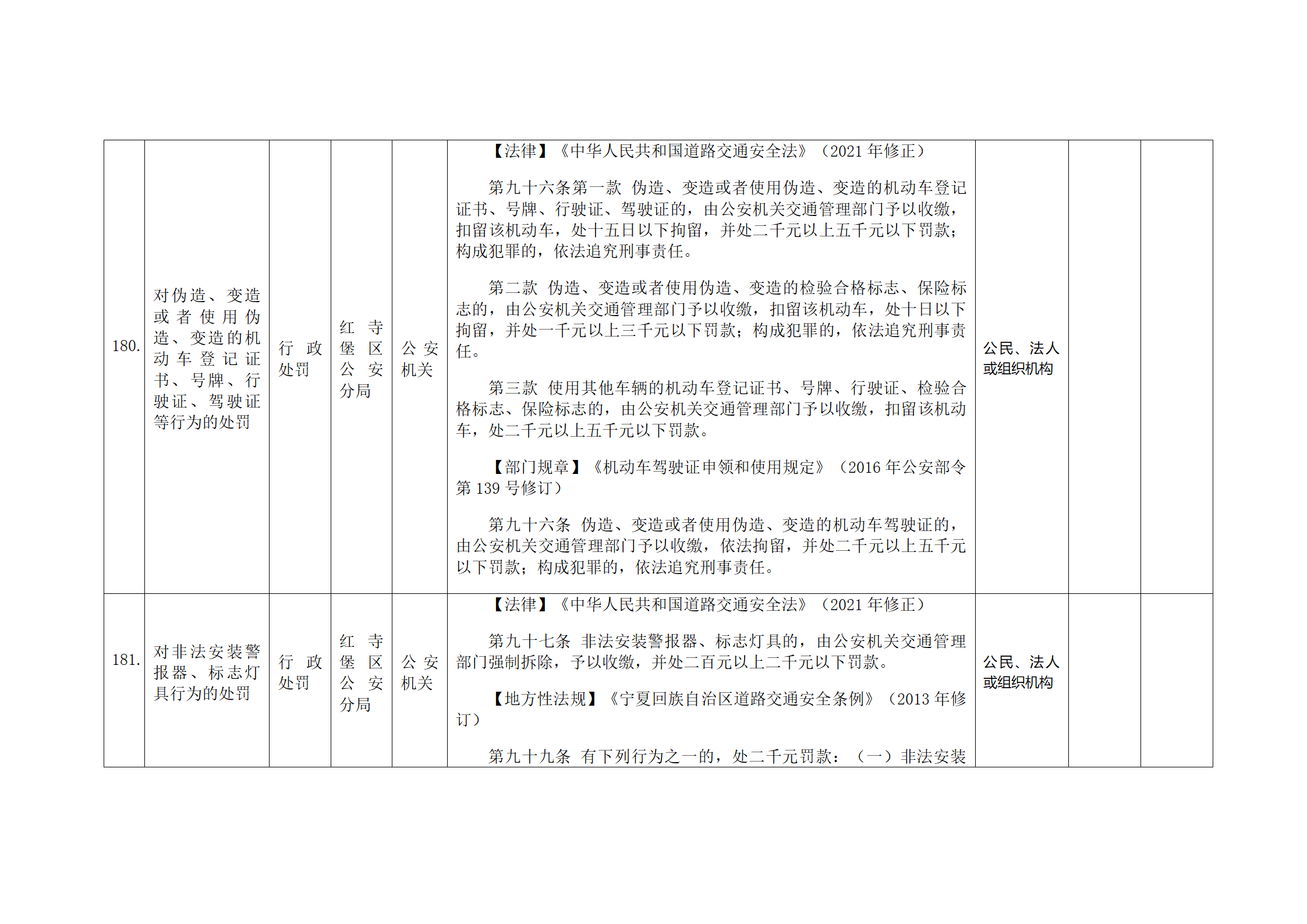 红寺堡区公安分局行政处罚事项清单