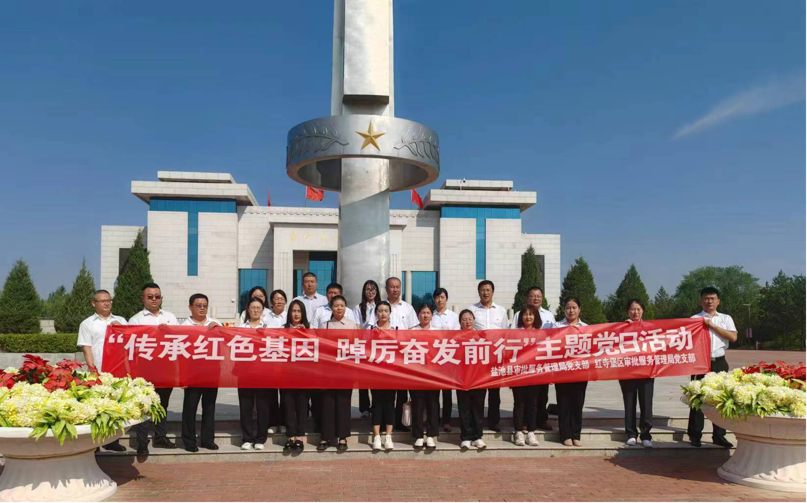 为深入学习宣传贯彻党的二十大精神,重温党的光辉历史,追寻红色足迹,传承红色文化,赓续红色精神,激励广大党员坚定理想信念,增强党性意识,不断提高党组织的创造力、凝聚力和战斗力,推动宣传贯彻党的二十大精神走深走实,同时结合主题教育有关要求,学习借鉴盐池县在深化“放管服”改革,优化营商环境、政务服务等方面的工作成效,助推我区全国易地搬迁移民致富提升示范区建设再上新台阶。2023年8月16日,红寺堡区审批服务管理局党支部与盐池县审批服务管理局党支部联合开展“传承红色基因 踔厉奋发前行”主题党日活动。
